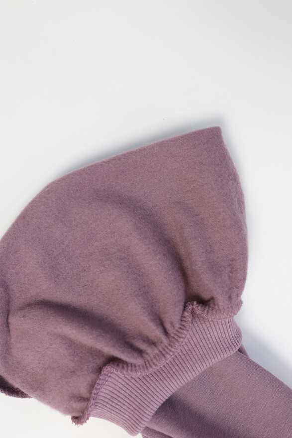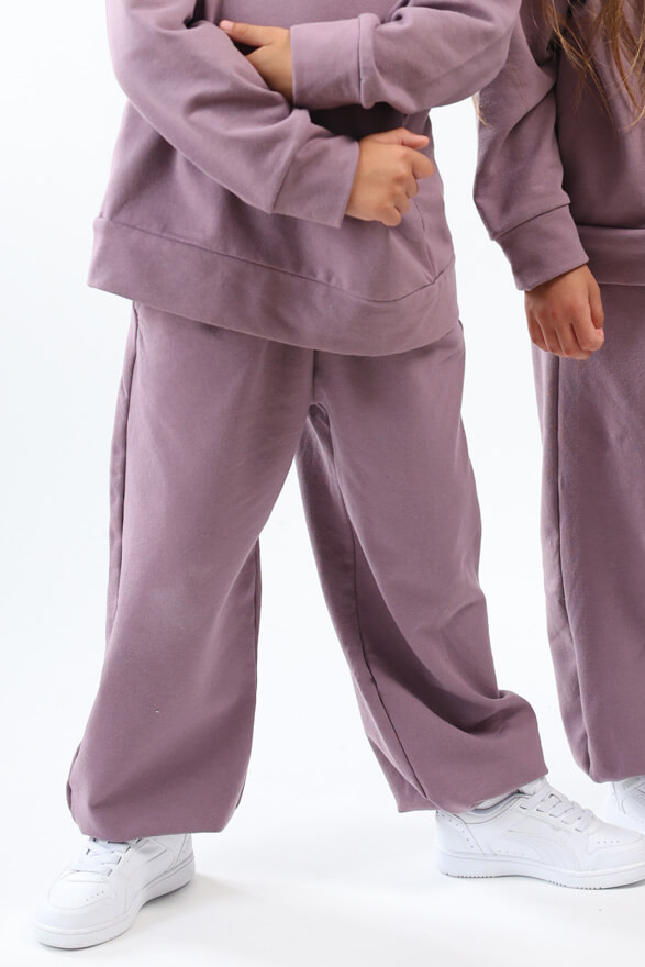 Fioletowe, szerokie spodnie dresowe ocieplane meszkiem ze ściągaczem, regulowane w pasie.