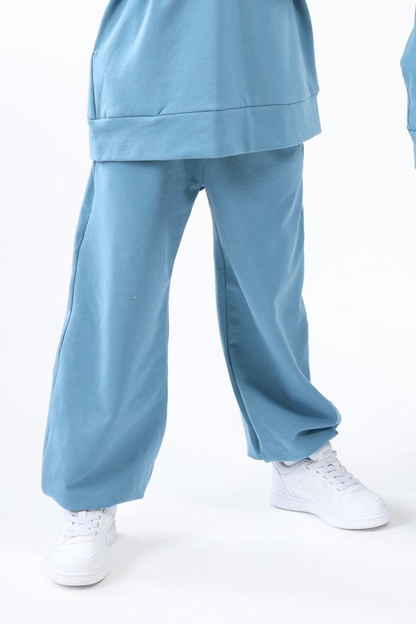 Niebieskie, szerokie spodnie dresowe ocieplane meszkiem ze ściągaczem, regulowane w pasie.