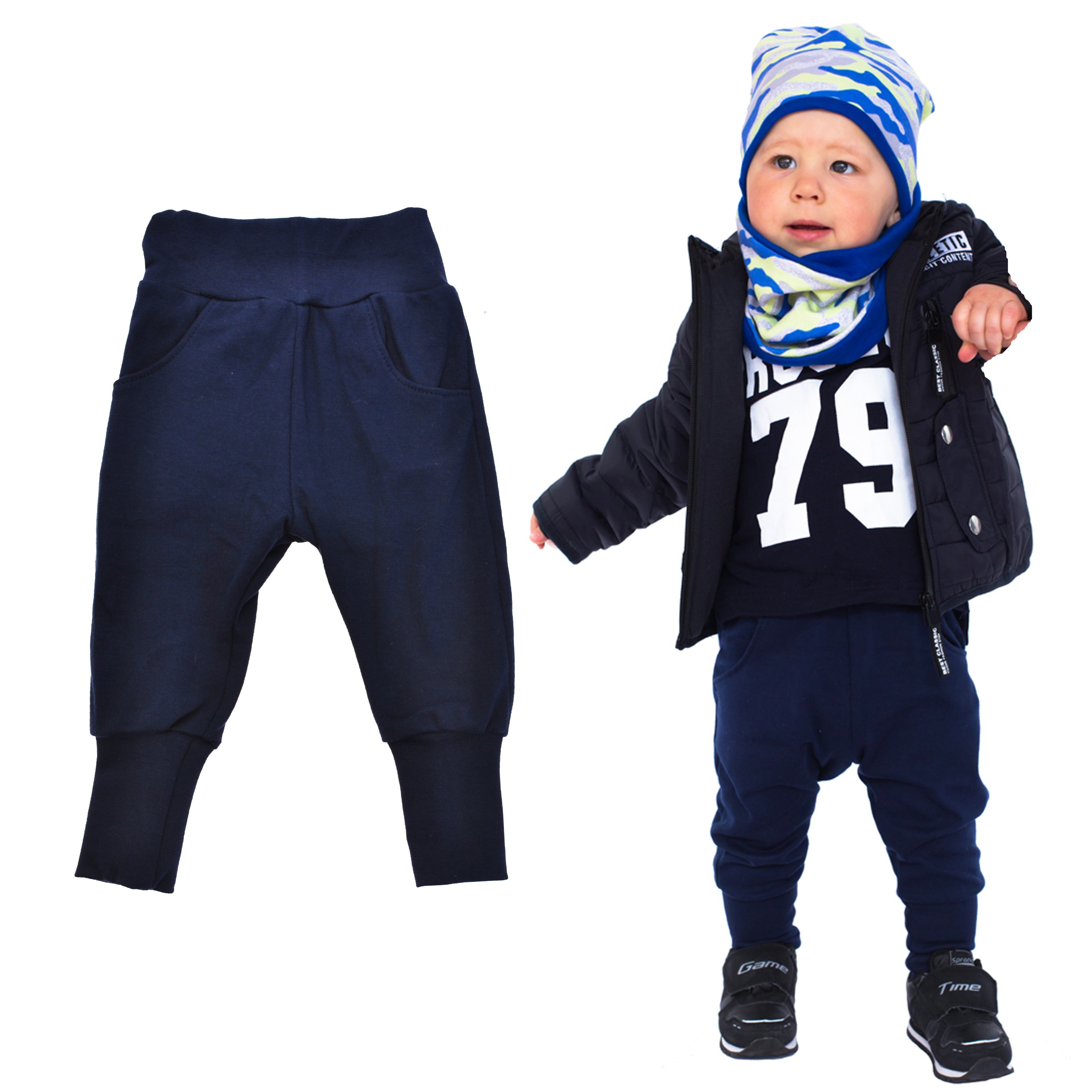 Wywijane ściągacze przy nogawkach - umożliwiają regulację długości spodni, funkcja przydatna w miarę wzrostu malucha ułatwia też wkładanie stopy podczas ubierania